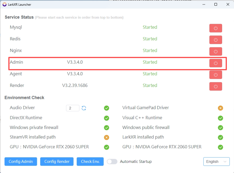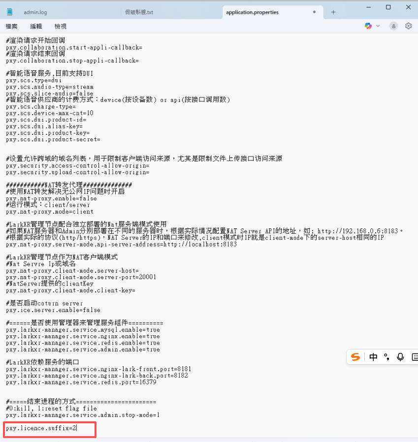 It is possible that IP drift has caused incorrect regional identification.The issue can be resolved by setting`pxy.licence.suffix=2`in the configuration file for overseas environments,including Hong Kong. 1. Open application.properties at ...\LarkXR\LarkXR-Standlone\larkxr-center\  3. Add `pxy.licence.suffix=2` at the bottom of the application.properties  4. Save. 5. Restart Admin .